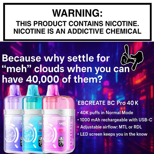 Level up your vape game with the EBCREATE BC Pro 40K Disposables—high-performance devices crafted for flavor lovers and tech fans alike. Featuring dual mesh coils, Autofill technology, an LED display, and a rechargeable design, these disposables pack serious punch into a sleek, pocket-sized build.