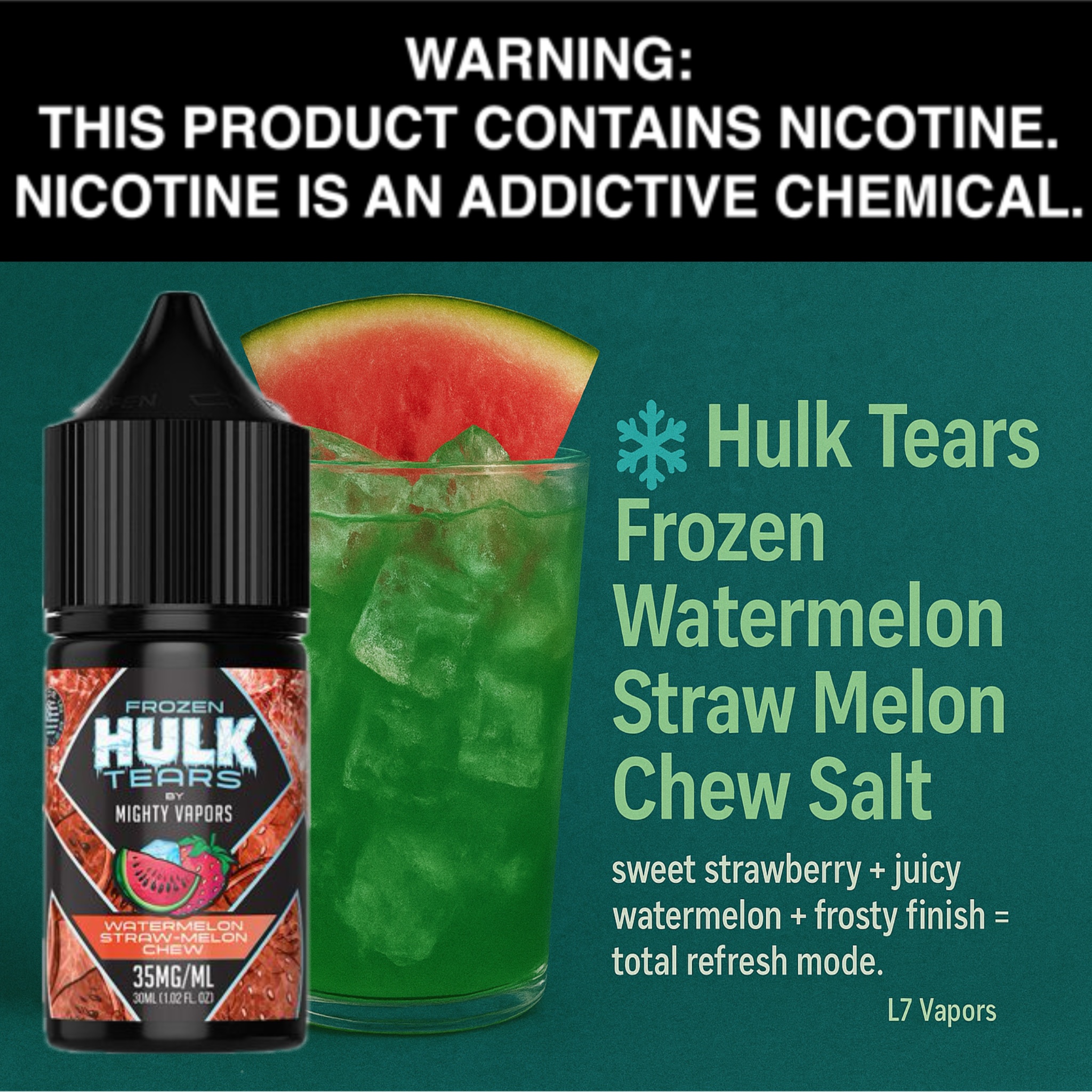Mighty Vapors x Hulk Tears Salts Frozen Watermelon Straw-Melon Chew – A Frosty, Fruity Knockout.