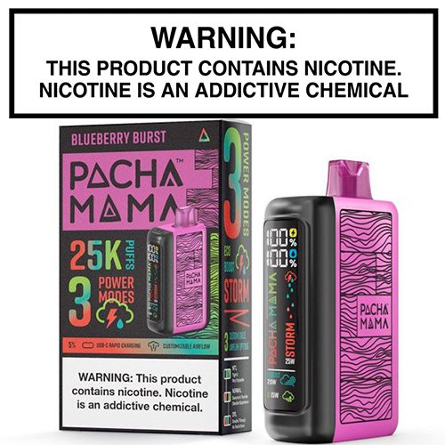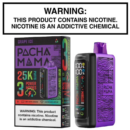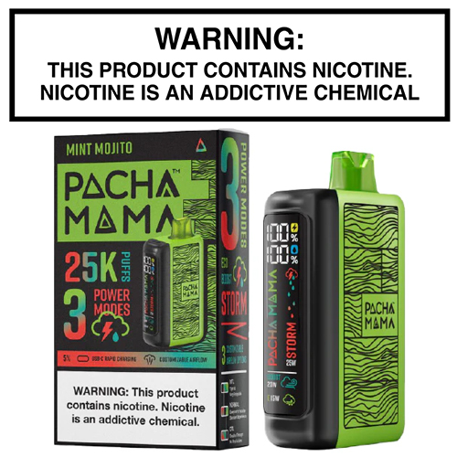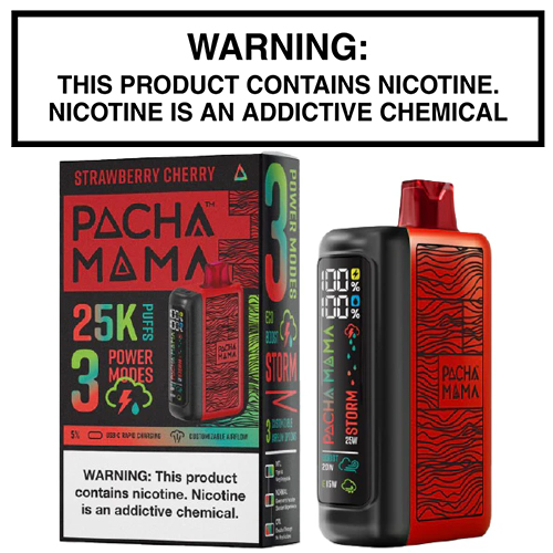 Pachamama, known for its top-tier e-juice flavors, steps into the disposable vape game with the Pachamama 25,000. Designed with their signature bottle patterns, this powerhouse device delivers up to 25,000 puffs and features fully adjustable airflow and a vibrant LED display. What truly sets it apart is its three vaping modes, allowing users to customize flavor, vapor density, and puff count: Eco Mode (15W, 25,000 puffs), Boost Mode (20W, 20,000 puffs), and Storm Mode (25W, 17,000 puffs).